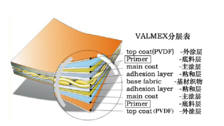 Primer涂層是它介于PVDF涂層和PVC涂層之間,即是在PVC涂層上先涂敷Primer層,然后在Primer層上涂敷100%PVDF。Primer的硬度介于PVDF和PVC之間,這種過渡既能很好的解決剝離的問題,同時并不需要“稀釋”PVDF的含量。100%PVDF涂敷的外表層仍然能發(fā)揮其應(yīng)有的作用,保證其各項性能指標(biāo)不會被降低。
