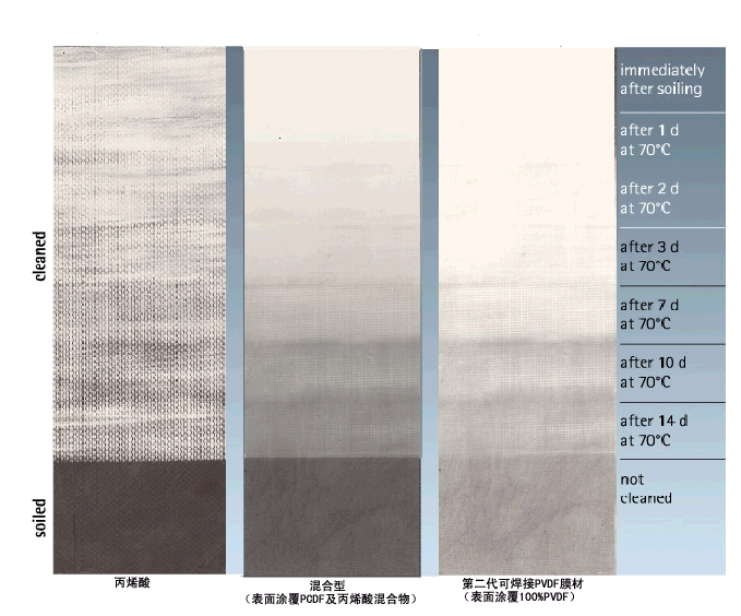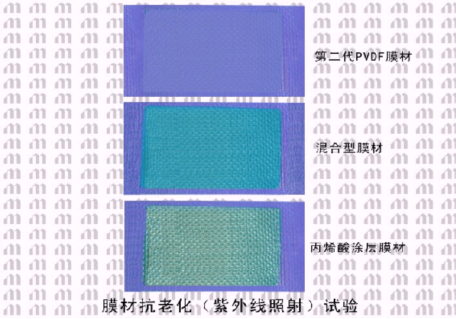 由于加入了一定比例的丙烯酸酯(Acrylic),從而嚴(yán)重影響了PVDF涂層在自潔性、耐污性和耐久性等各方面的性能。所以,盡管“混合型PVDF膜材”在抗剝離性能方面有了很大的提高,但是在其自潔性、紫外線輻射下的抗老化性、耐污性及耐久性方面的性能是相對下降了很多。