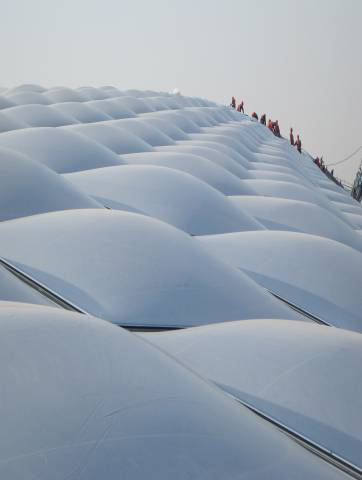 不僅如此,這種膜還具有良好的聲學(xué)性能,可有效消除回聲避免了玻璃層頂產(chǎn)生的噪音;具有的自清潔功能,使灰塵不易附在其表面。這種材料另外的一大優(yōu)點(diǎn)就是可在現(xiàn)場(chǎng)預(yù)制成薄膜氣泡,方便施工和維修;近年來,由ETFE 制成的膜材料替代傳統(tǒng)的玻璃和其它高分子采光板用于大型建筑物的屋面或墻體,顯示出無可比擬的優(yōu)勢(shì)。