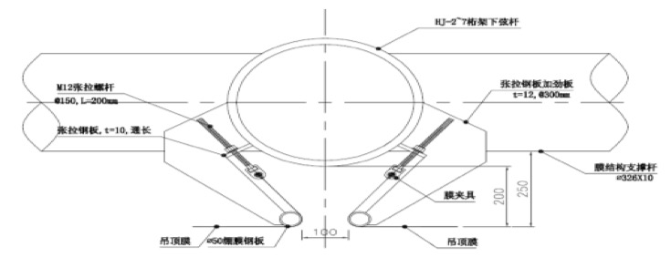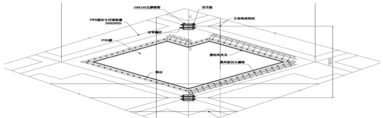 雖然預(yù)張力對(duì)骨架式膜結(jié)構(gòu)的形態(tài)的影響不及張拉膜,但也必須引入足夠大的張力,保證結(jié)構(gòu)受力特性,避免在風(fēng)荷載作用下膜面發(fā)生較大震動(dòng),導(dǎo)致松弛膜面凹陷。骨架一般暴露于膜內(nèi)側(cè),而且膜的透光性更加突顯骨架的室內(nèi)視覺效果,因此,骨架的布置、形式、材料、節(jié)點(diǎn)等是設(shè)計(jì)考慮的重點(diǎn),要力求簡潔、美觀。