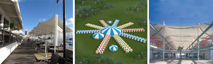 遮陽對降低建筑能耗,消減紫外線照射有顯著的效果。隨著人們對建筑遮陽的研究日趨成熟,膜結(jié)構(gòu)形式的戶外遮陽將遮陽的品質(zhì)與舒適性、觀賞性進(jìn)行有機(jī)結(jié)合,同時為了最大限度的降低太陽對人的熱輻射量與建筑周圍環(huán)境溫度而推動了膜材料的革命性發(fā)展。膜結(jié)構(gòu)憑借施工速度快、壽命長、造型多樣化的曲面形式正被越來越多的公共建筑項(xiàng)目所采用。